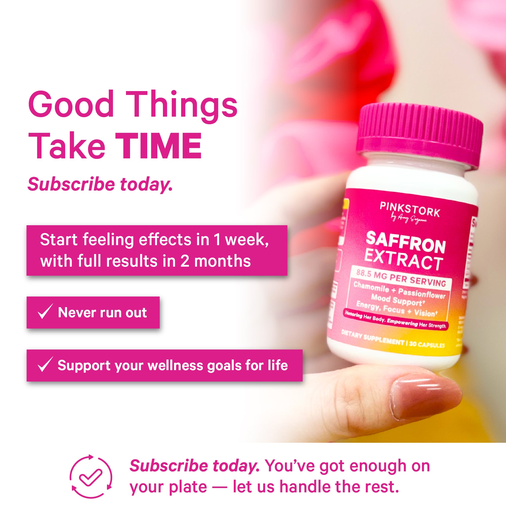 Saffron Mood Balance pairs well with other Pink Stork hormone balance or cortisol support supplements. Consult your healthcare provider to ensure your needs are being met.